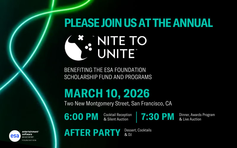 Nite to Unite welcomes developers, producers, publishers, and leaders from across the gaming industry to honor individuals and companies who drive social impact of gaming, and to raise funds for the ESA Foundation’s charitable contributions. Proceeds from the gala fuel the ESAF’s scholarship programs and school-based support for the next generation of game makers.