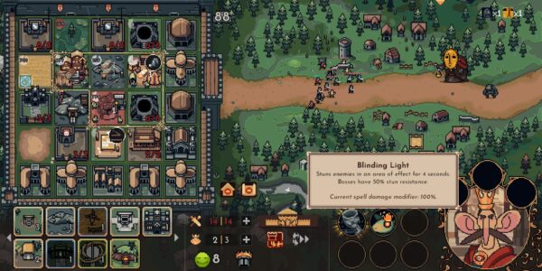 Production tiles include wheat farms, wells, clay mines, and sawmills, while different troops can be produced via peasant's huts, madhouses, hunter's lodges, and bone pits. Production tiles produce finite resources and must be replaced, moved, or changed. Troops automatically engage enemy forces to defend the walls, and if the walls are reduced to zero, that run ends.